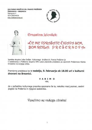 Dogodki « Februar 2020 » PoToSrČePeSoNe 12 3456789 10111213141516 17181920212223 242526272829 Otvoritev razstave slikarskih kolonij 06.02.2020 ob 18:00 Več VeÄer domaÄih pesniÅ¡kih ustvarjalcev 07.02.2020 ob 18:00 Več Pohod po poti kulturne dediÅ¡Äine 08.02.2020 ob 07:30 Več Osrednja slovesnost pri PreÅ¡ernovem spomeniku 08.02.2020 ob 13:00 Več Premiera predstave ERNESTINA 09.02.2020 ob 18:00 Več Å KRATOVANJE 16.02.2020 ob 17:00 Več
